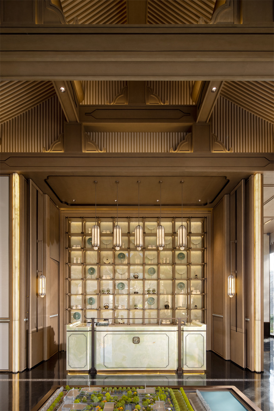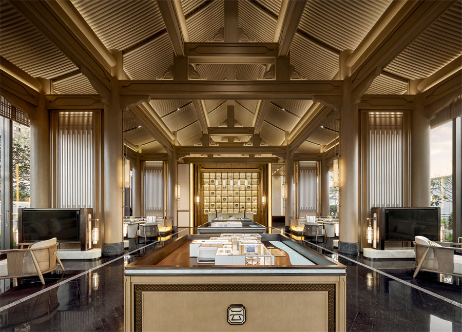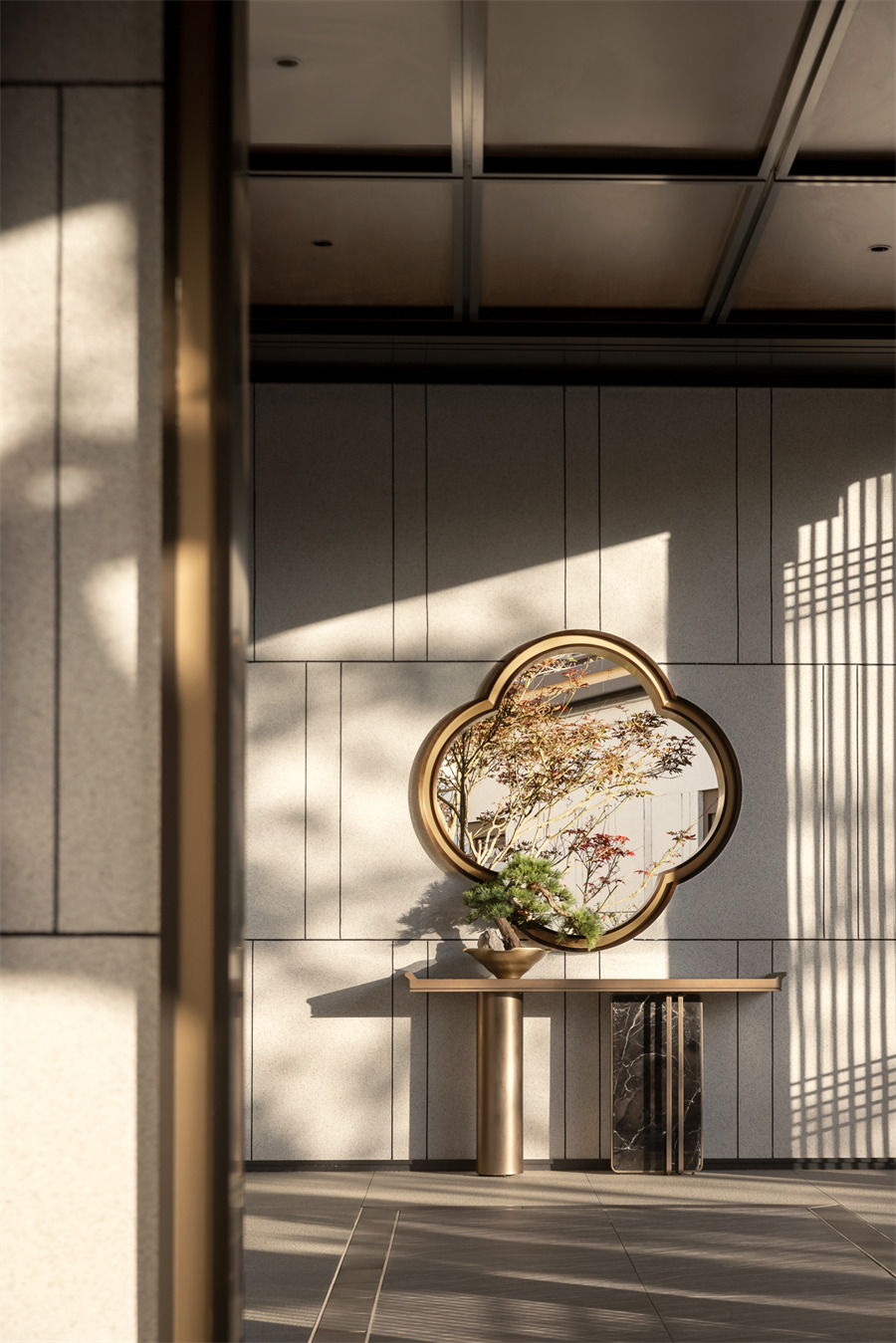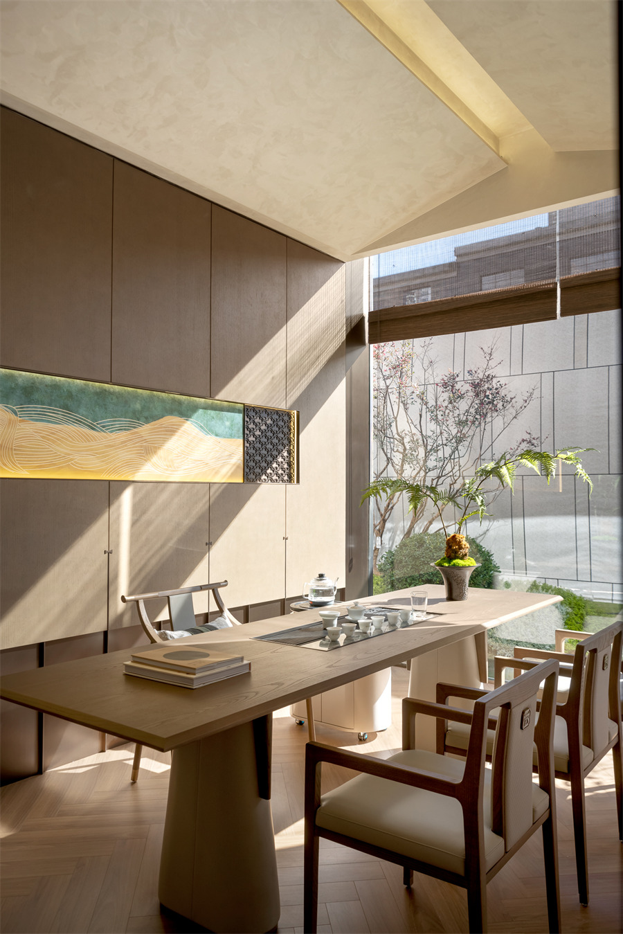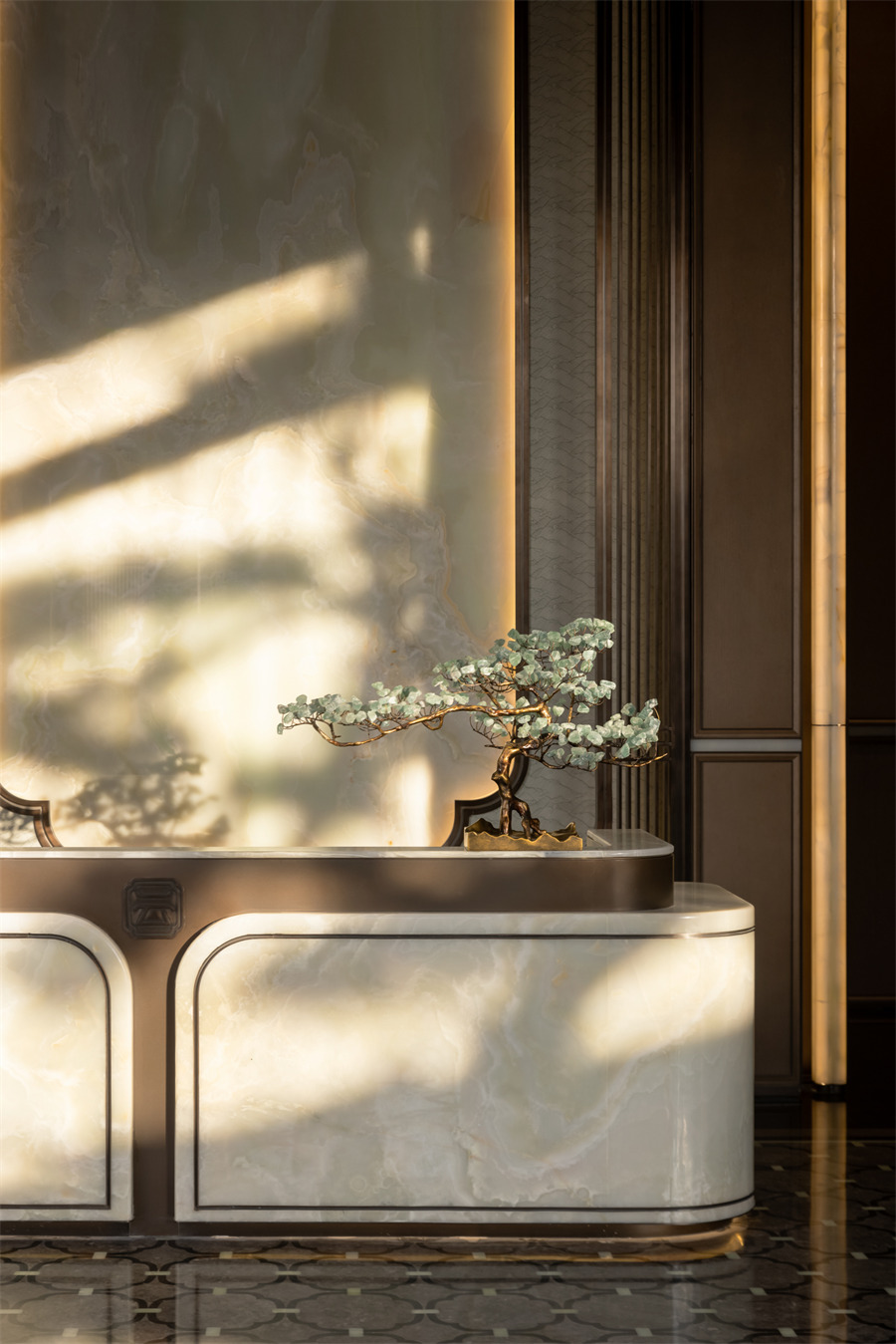 中式庭院的美,在於“步移景異”的敘事感。設計師以軟裝爲筆,將空間化作一首立體的詩。 這不再是冰冷的模型陳列場--沙盤底座以天然玉石雕琢成硯臺造型,厚重、堅實給人以安心與信賴之感。