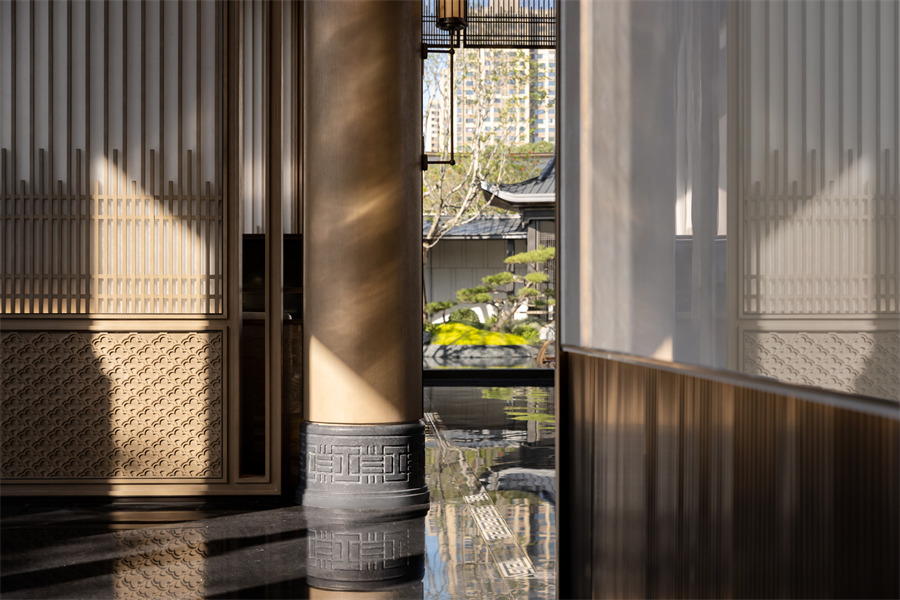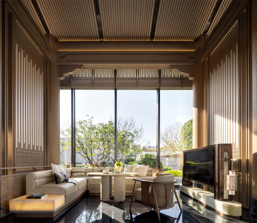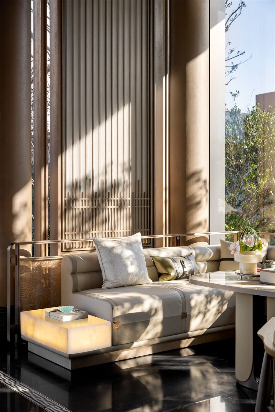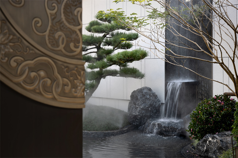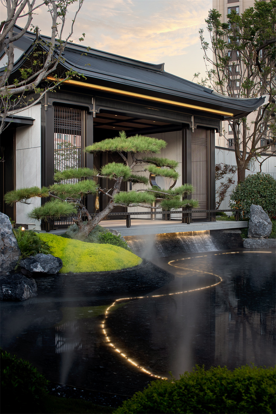 中式庭院的美,在於“步移景異”的敘事感。設計師以軟裝爲筆,將空間化作一首立體的詩。 這不再是冰冷的模型陳列場--沙盤底座以天然玉石雕琢成硯臺造型,厚重、堅實給人以安心與信賴之感。
