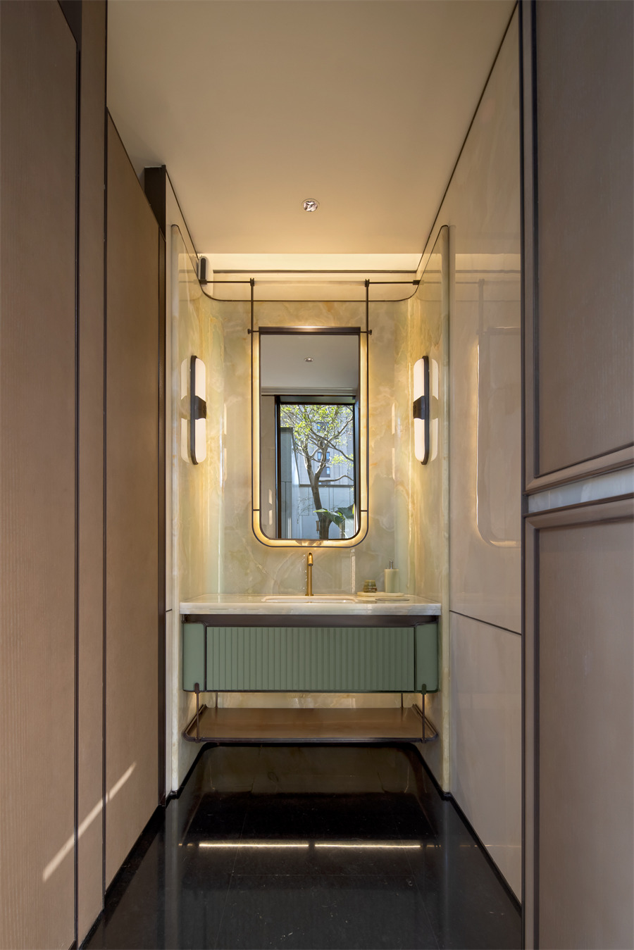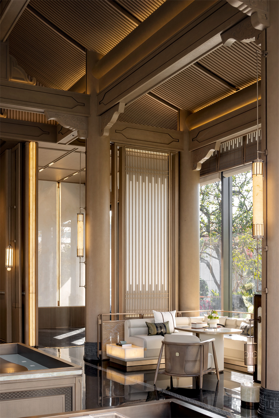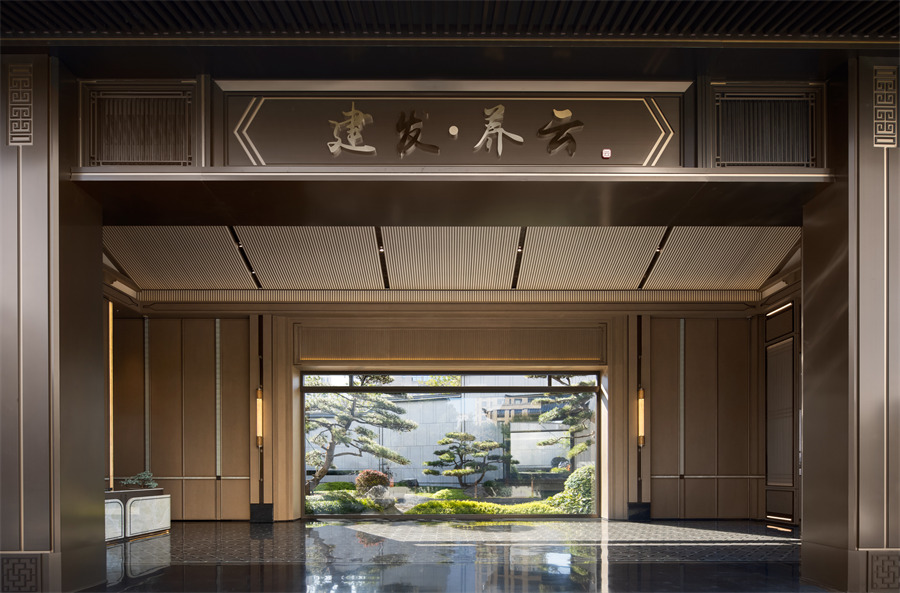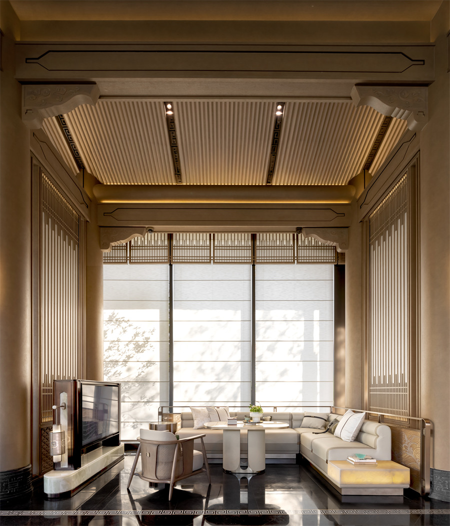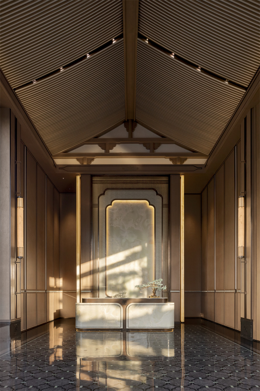 中式庭院的美,在於“步移景異”的敘事感。設計師以軟裝爲筆,將空間化作一首立體的詩。 這不再是冰冷的模型陳列場--沙盤底座以天然玉石雕琢成硯臺造型,厚重、堅實給人以安心與信賴之感。