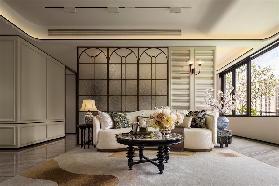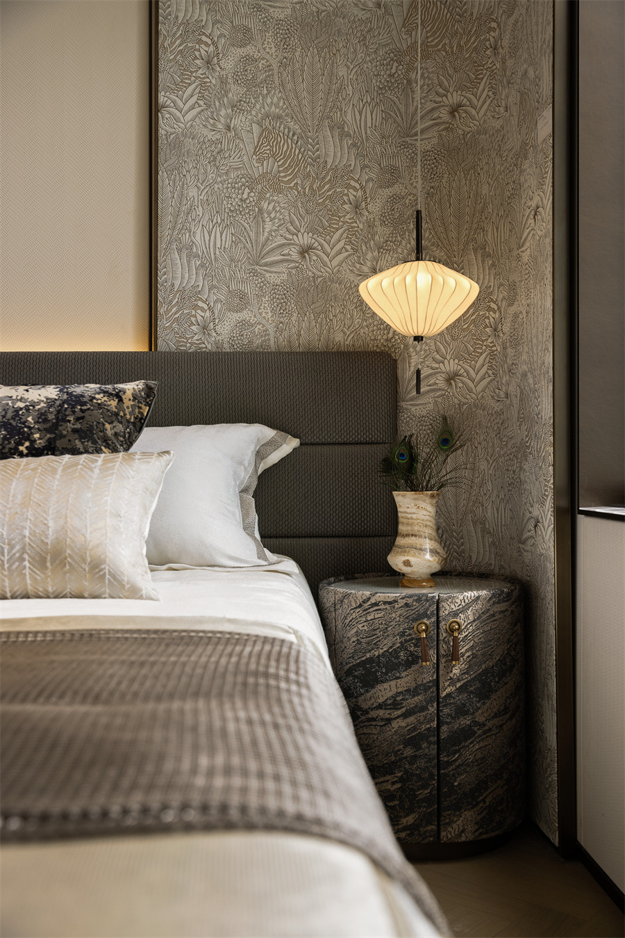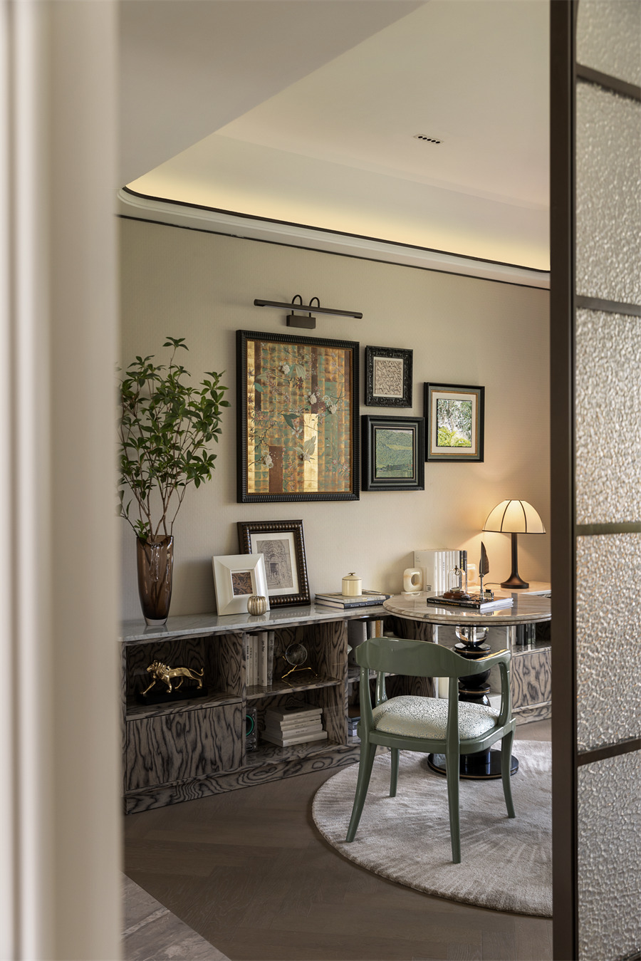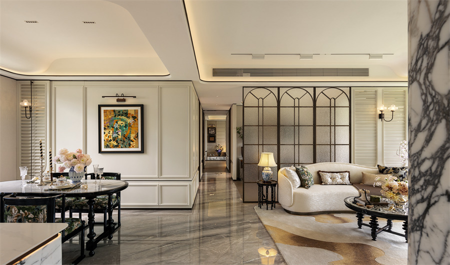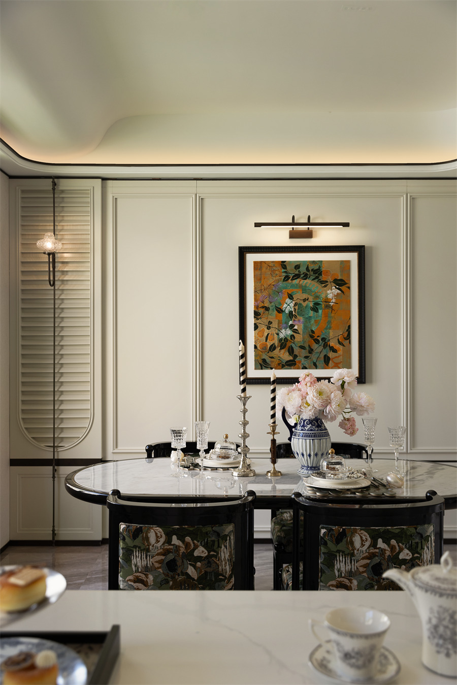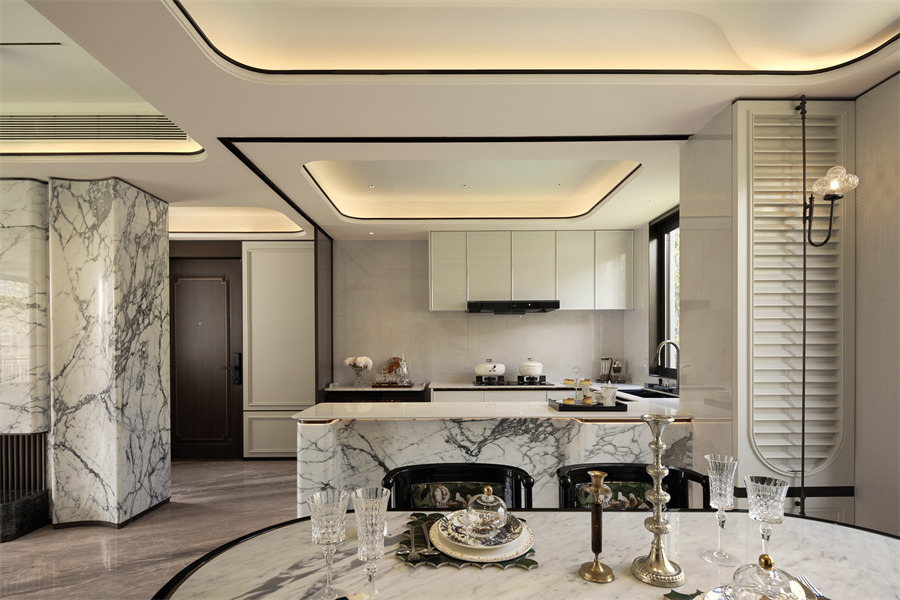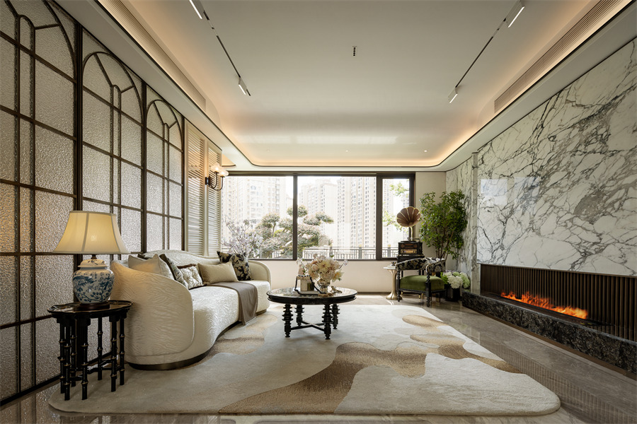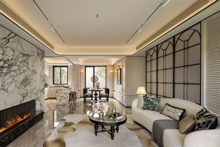 本空間以“現代東方雅緻”爲設計主旨,融合古典美學與當代生活理念。大面積天然大理石牆面搭配溫潤木質格柵,營造出沉穩而富有層次的視覺體驗。暖色調燈光與壁爐設計烘托溫馨氛圍,精選傢俱與藝術陳設呼應自然意境,提升空間人文氣質。整體佈局通透開闊,兼顧儀式感與日常舒適,詮釋高端住宅的精緻生活方式。