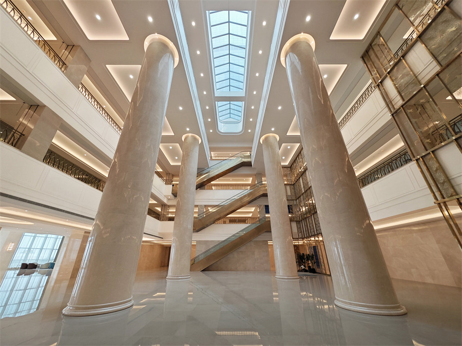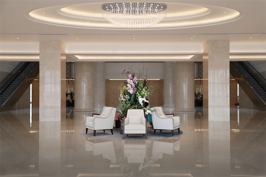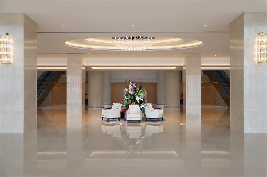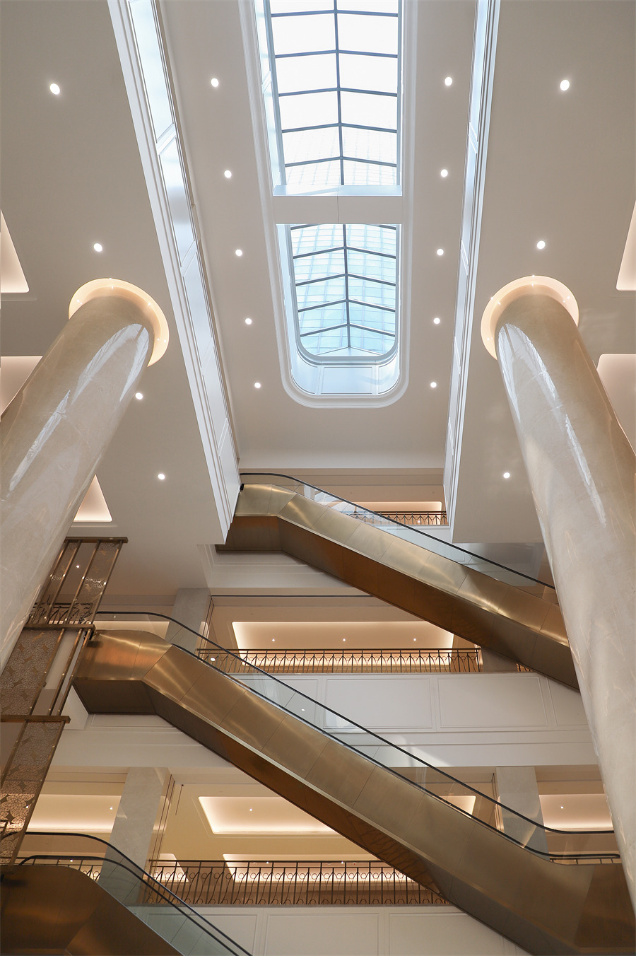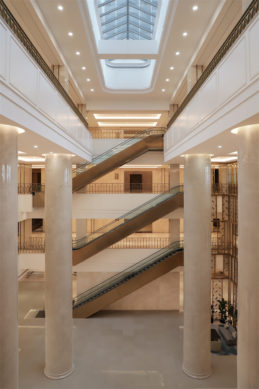 本項目以“光與空間的禮讚”爲設計核心,打造通透大氣的公共中庭。高挑空間配以天窗引入自然採光,結合點光源與線性照明,營造明亮而溫暖的氛圍。大理石立柱與金屬扶手電梯相映成趣,強化建築秩序感與現代質感。整體佈局疏朗有序,兼具功能性與美學高度,彰顯高端空間的尊貴氣質與人文關懷。