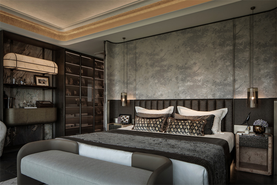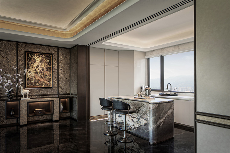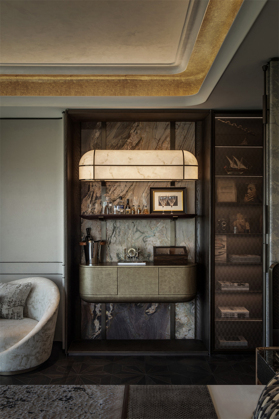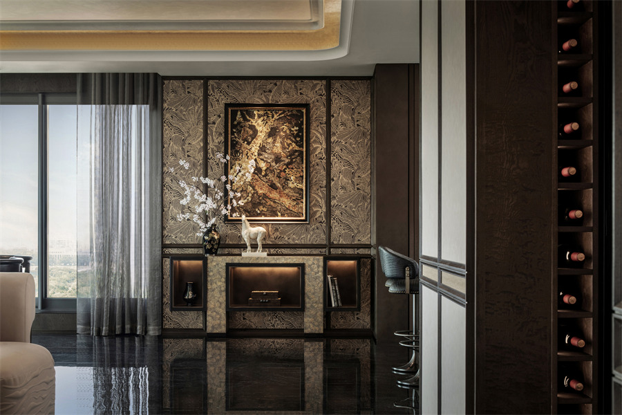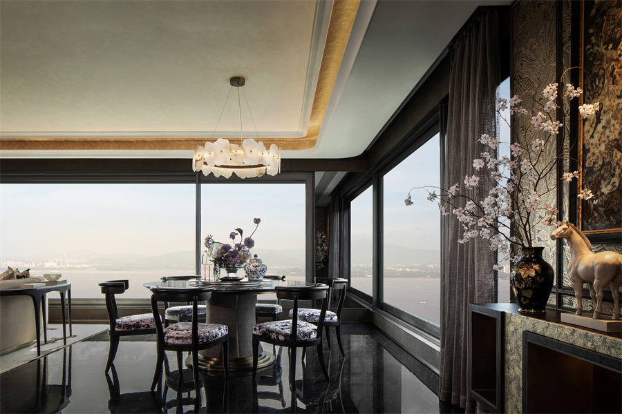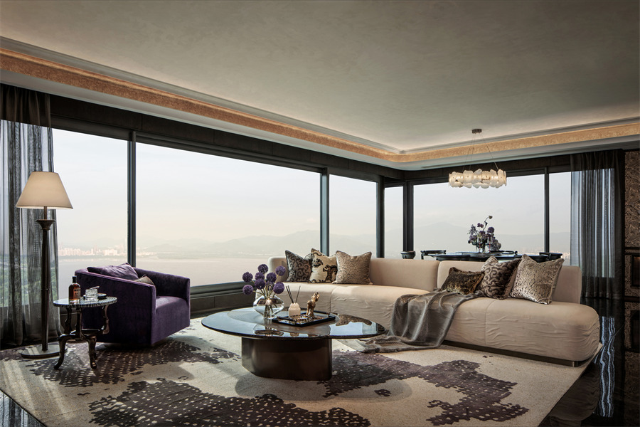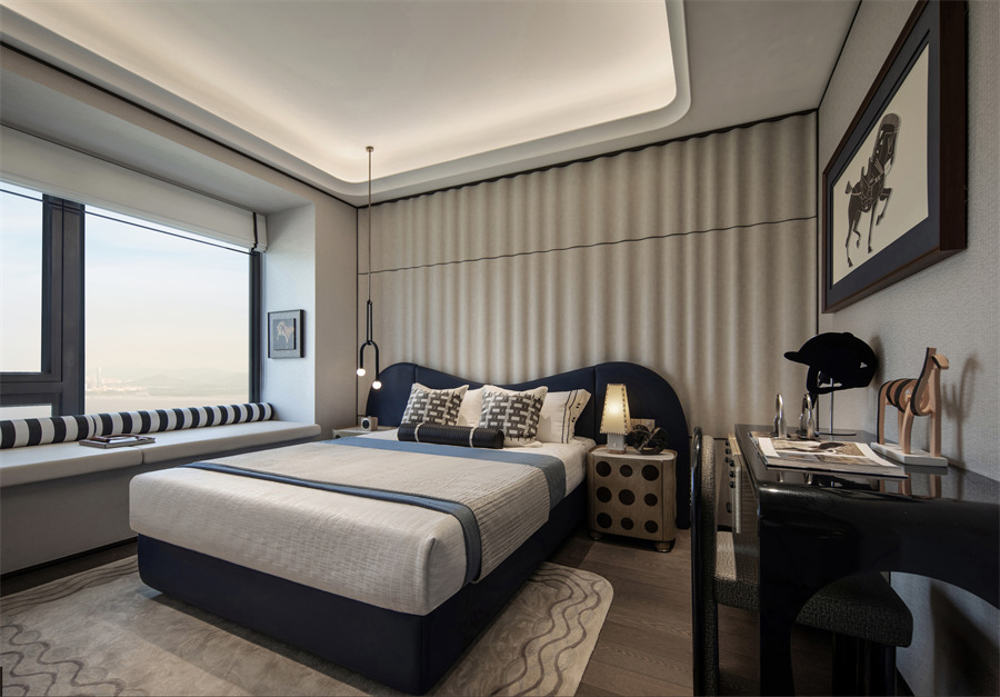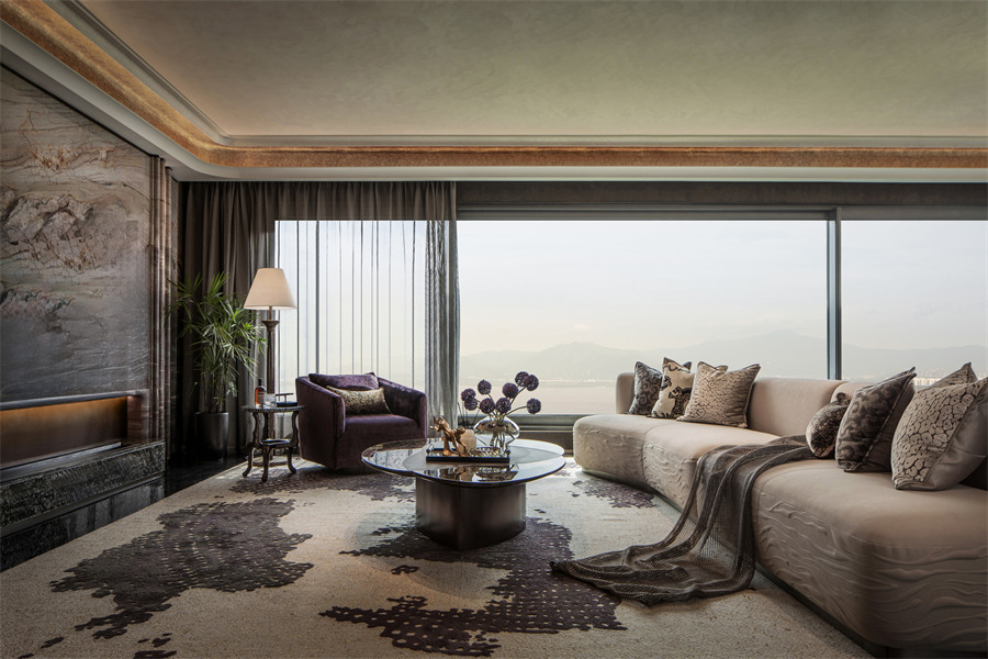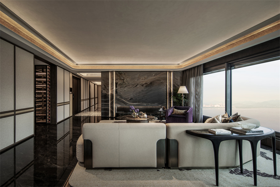 本項目以“都市中的靜謐棲所”爲設計理念,將現代奢華與自然意境完美融合。大面積落地窗引入壯闊海景,拓展空間視野。深色木飾面與藝術壁畫營造沉穩氛圍,搭配高級灰調軟裝與金屬細節,彰顯低調質感。地毯紋理呼應自然肌理,整體佈局開放而有序,打造兼具美學與舒適性的高端生活空間。