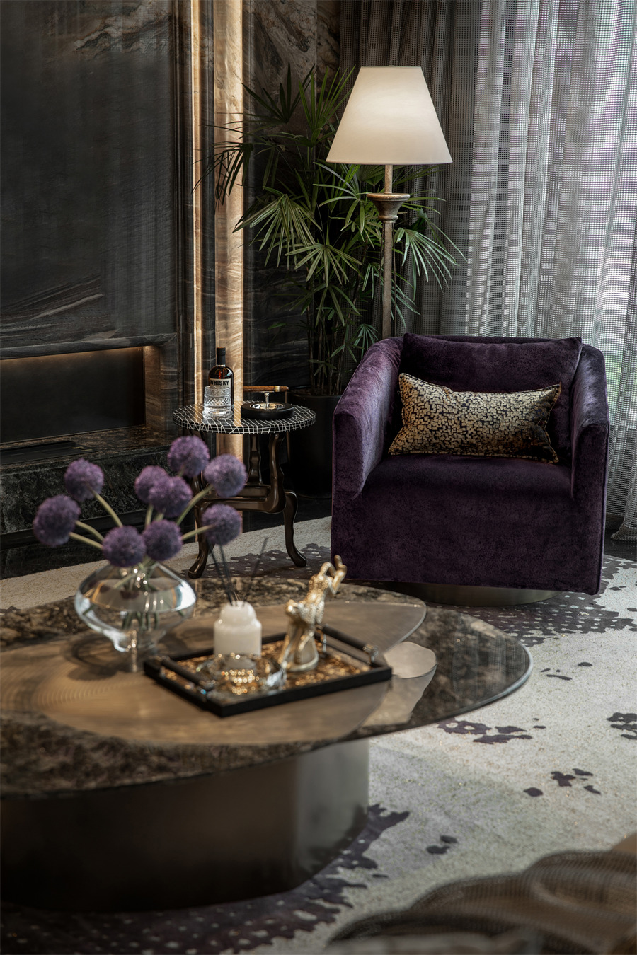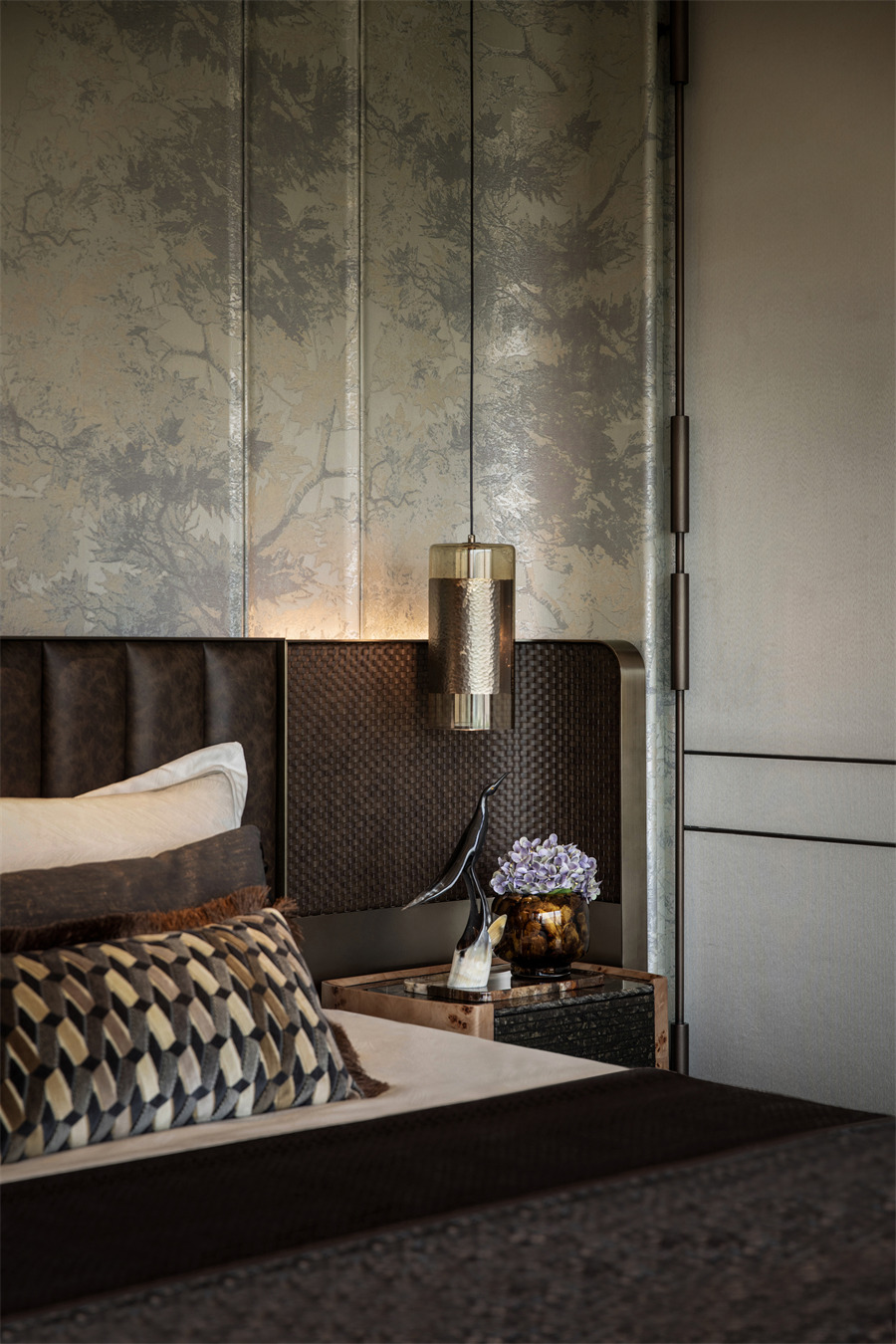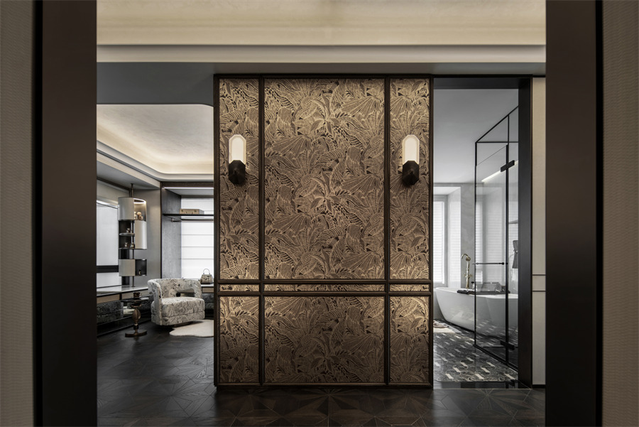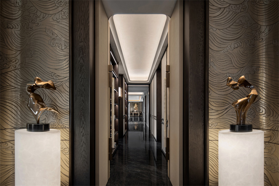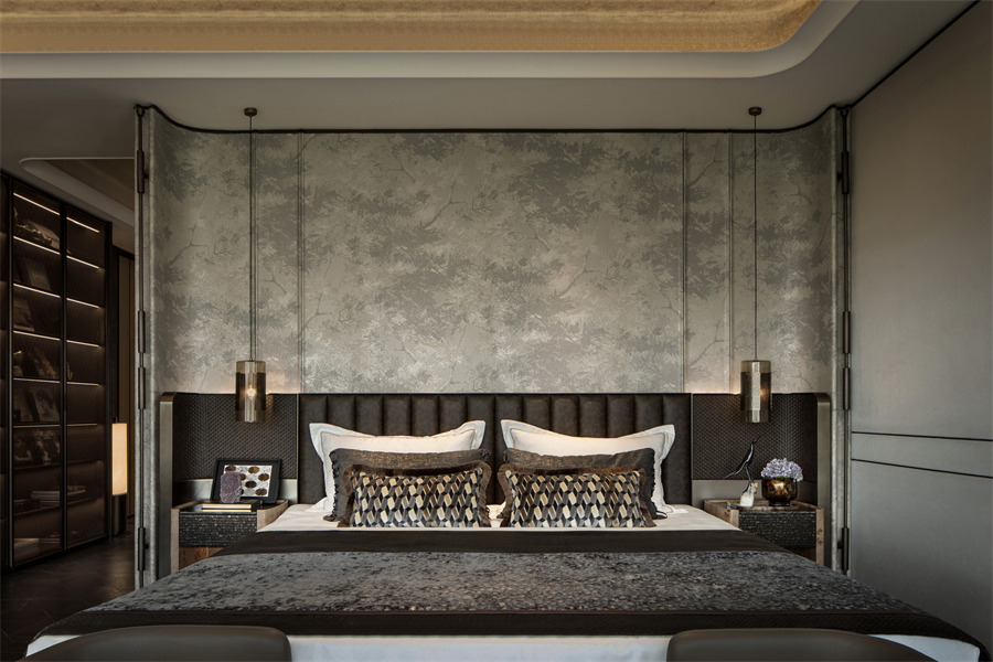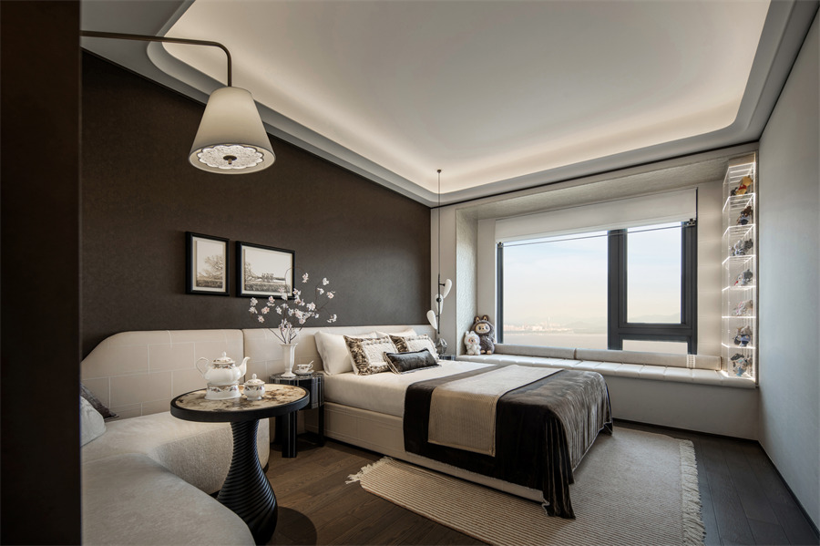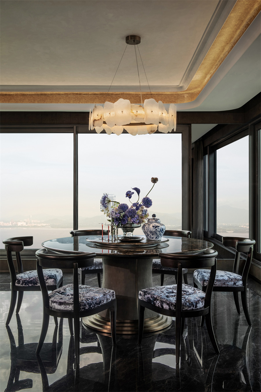 本項目以“都市中的靜謐棲所”爲設計理念,將現代奢華與自然意境完美融合。大面積落地窗引入壯闊海景,拓展空間視野。深色木飾面與藝術壁畫營造沉穩氛圍,搭配高級灰調軟裝與金屬細節,彰顯低調質感。地毯紋理呼應自然肌理,整體佈局開放而有序,打造兼具美學與舒適性的高端生活空間。