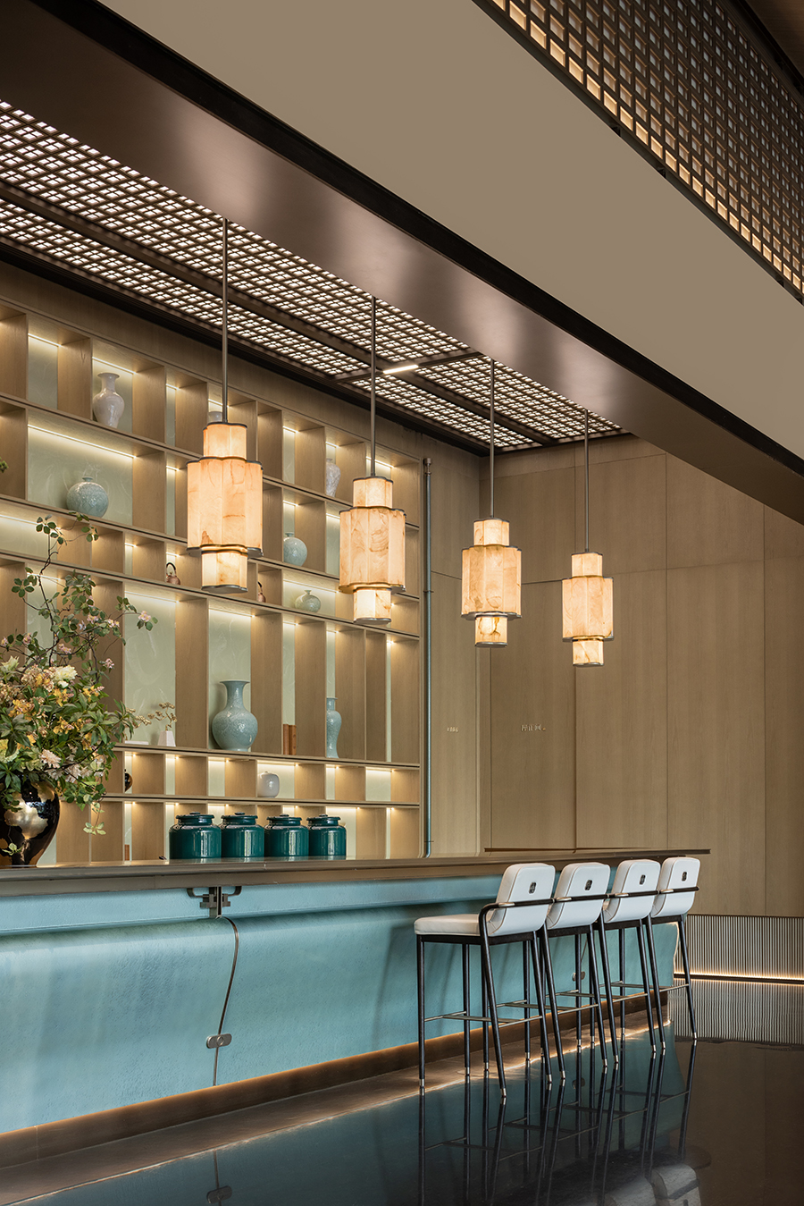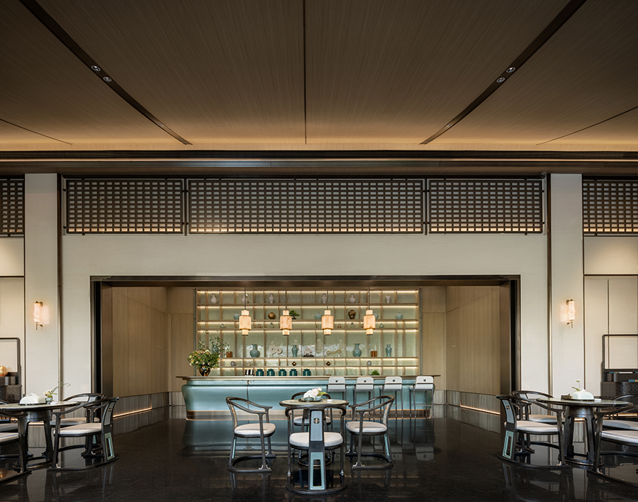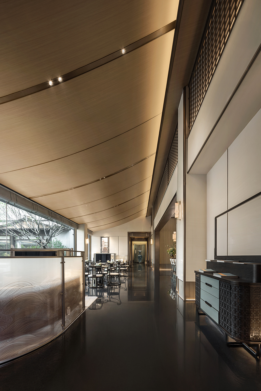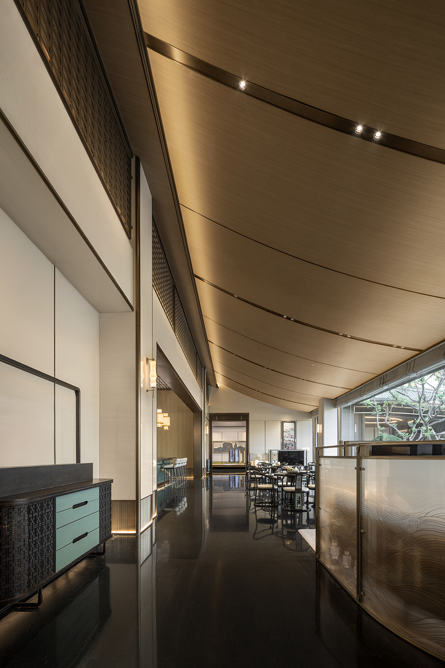 代宴饮空间。设计中运用月洞门、格栅屏风、素色绢纱等传统元素,结合温润木作、天然石材与低饱和色调,还原宋代“尚意重韵”的空间气