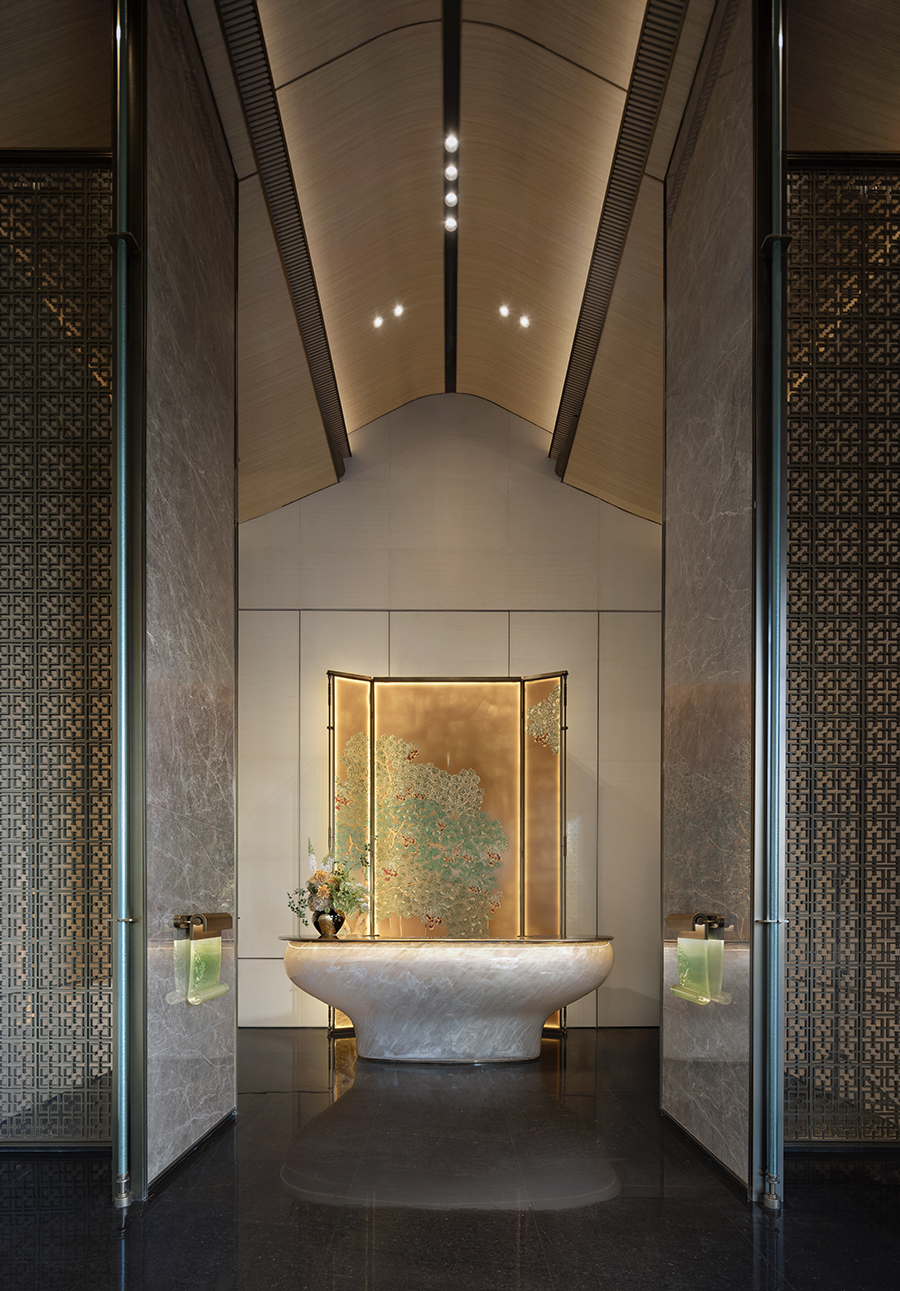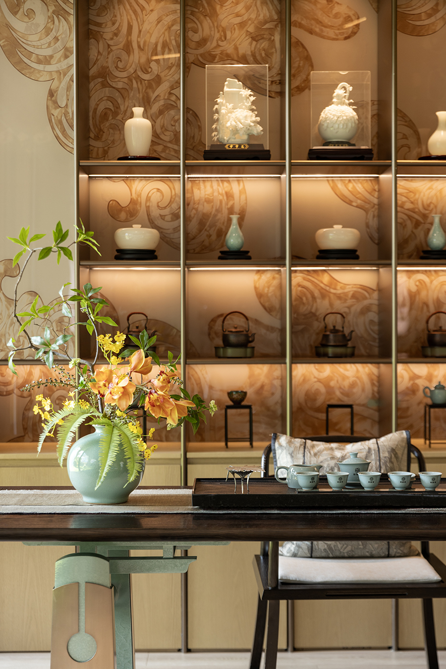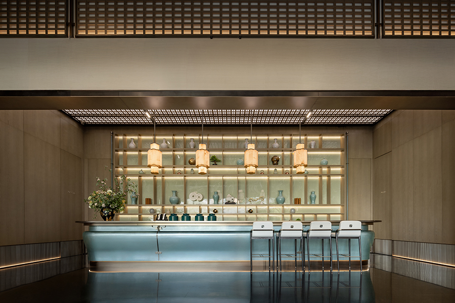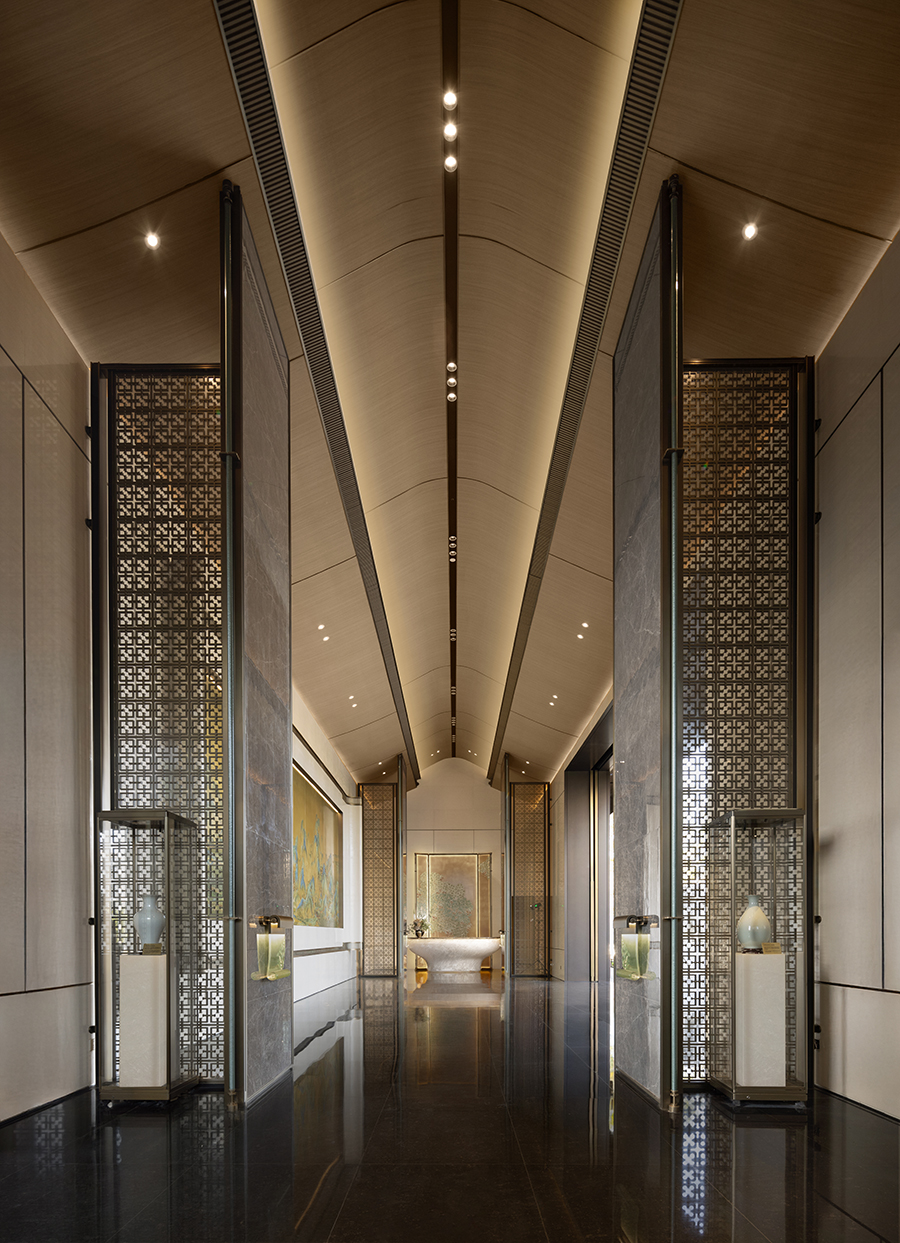 代宴饮空间。设计中运用月洞门、格栅屏风、素色绢纱等传统元素,结合温润木作、天然石材与低饱和色调,还原宋代“尚意重韵”的空间气