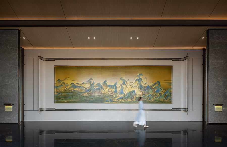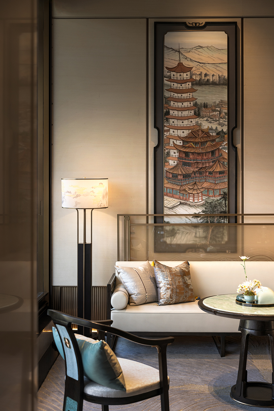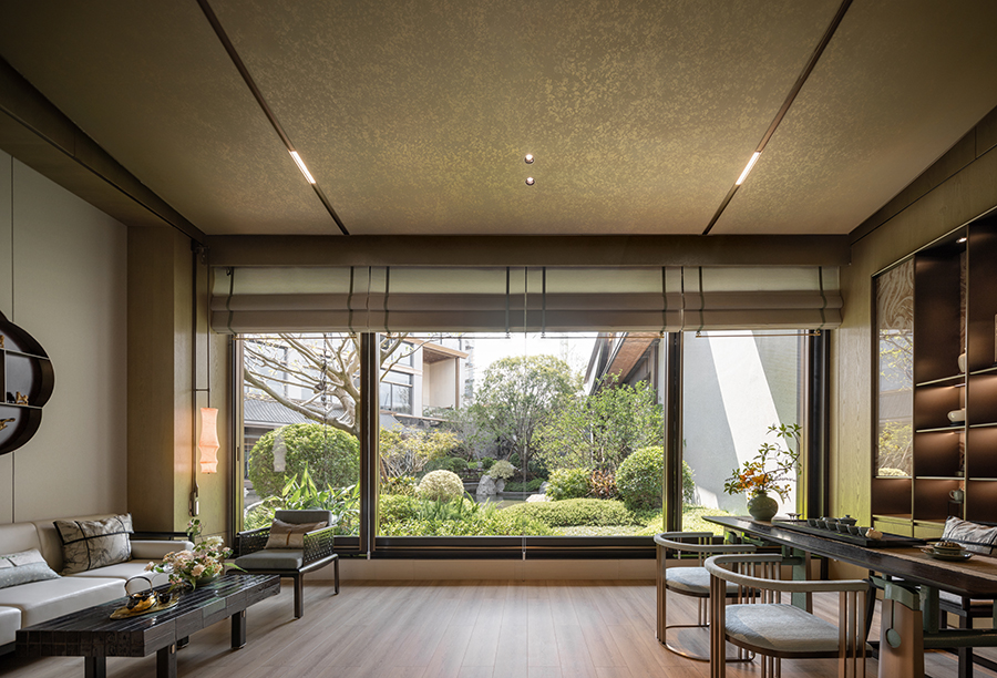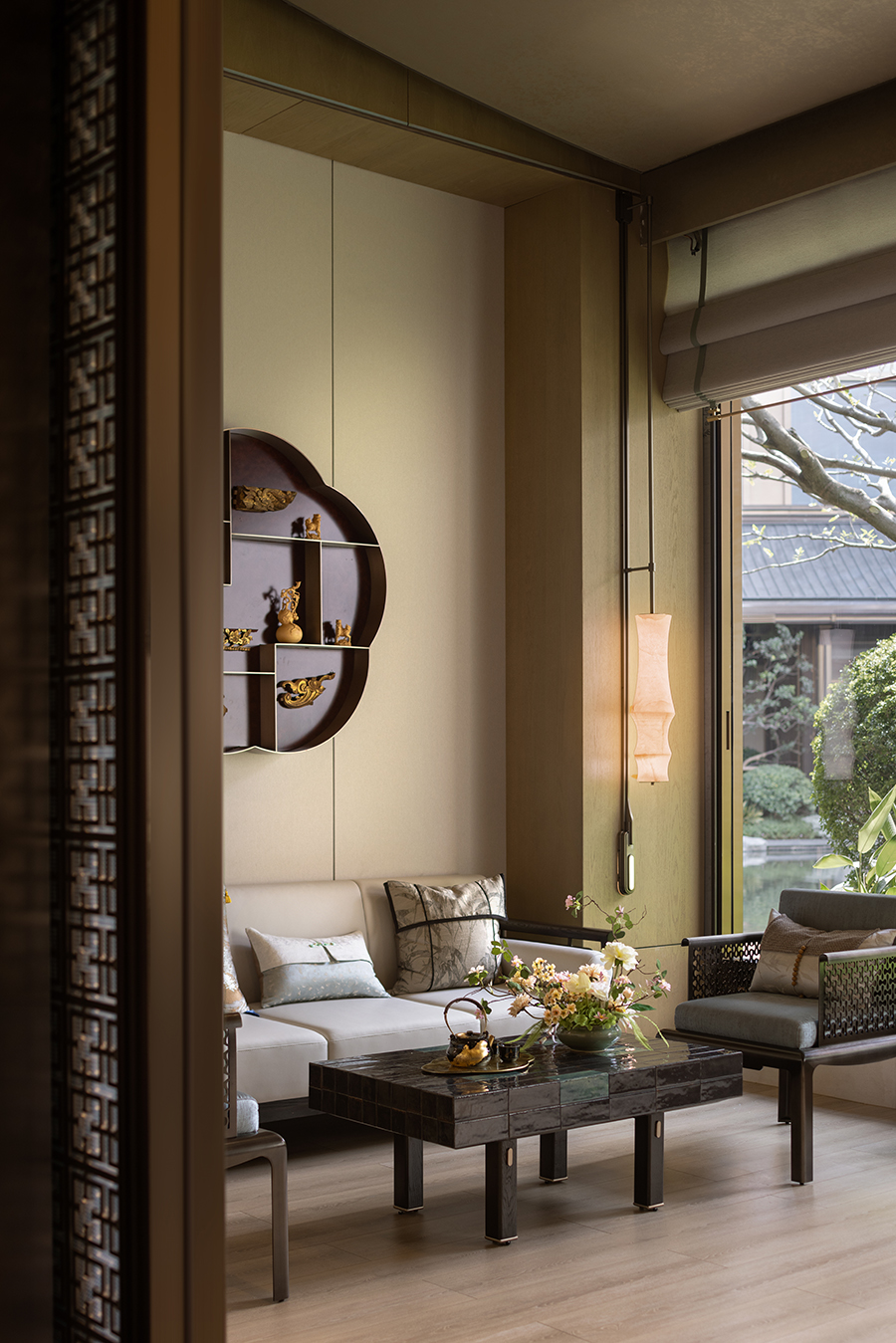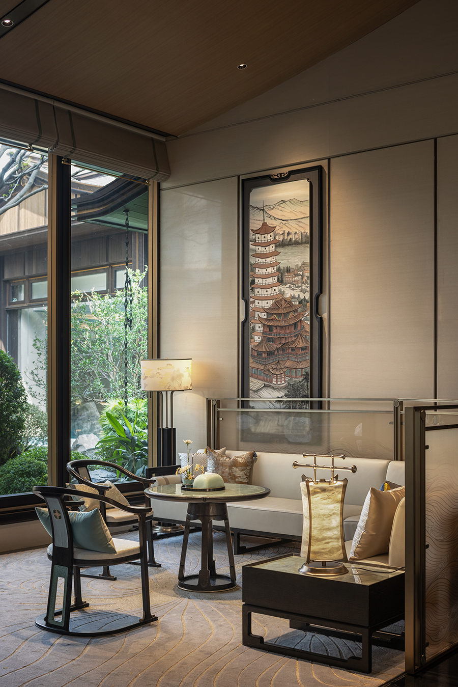 代宴饮空间。设计中运用月洞门、格栅屏风、素色绢纱等传统元素,结合温润木作、天然石材与低饱和色调,还原宋代“尚意重韵”的空间气